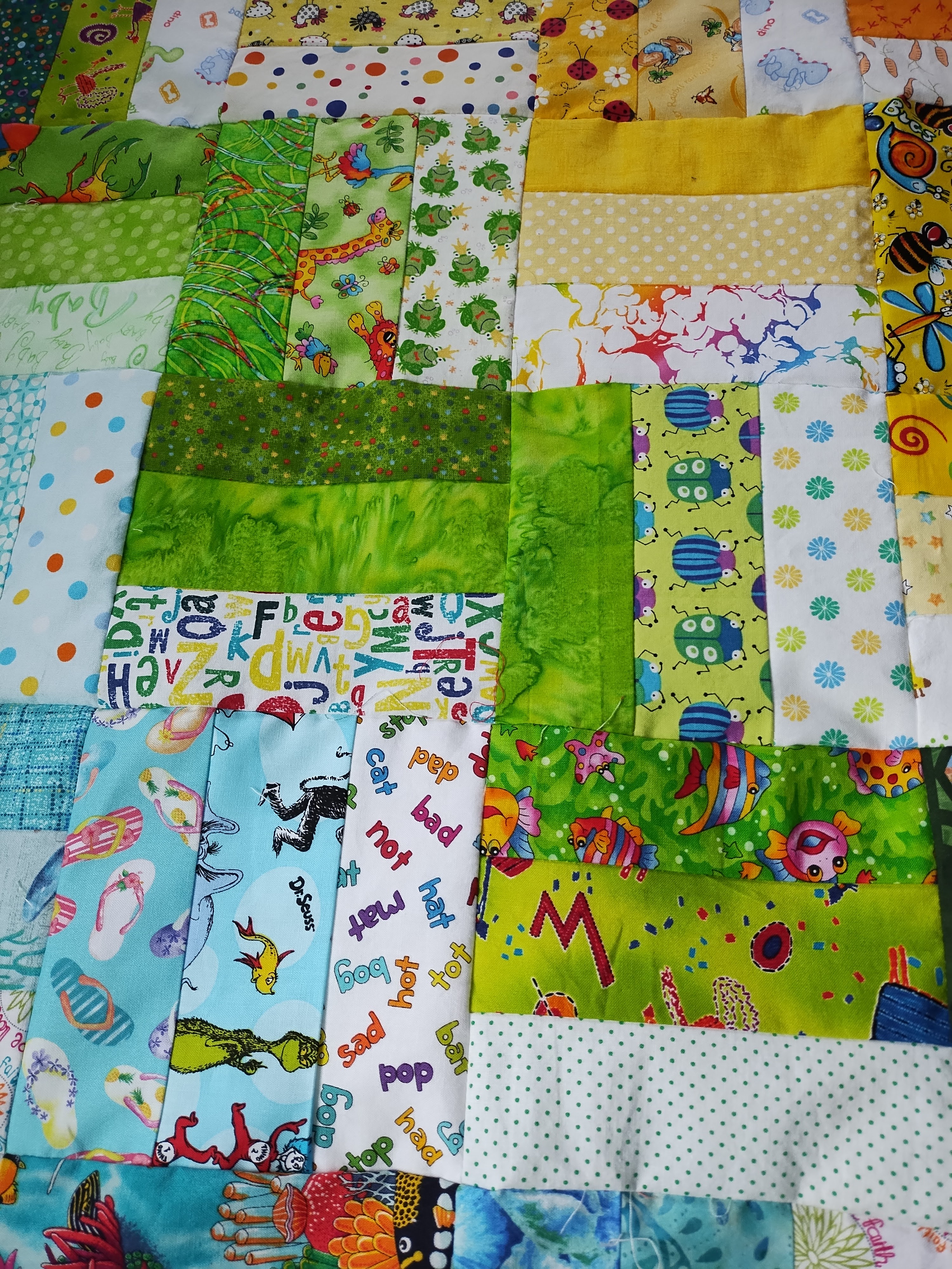 Making these blocks last year was fun! I enjoyed looking for novelty prints in all the colors, and using up scraps.